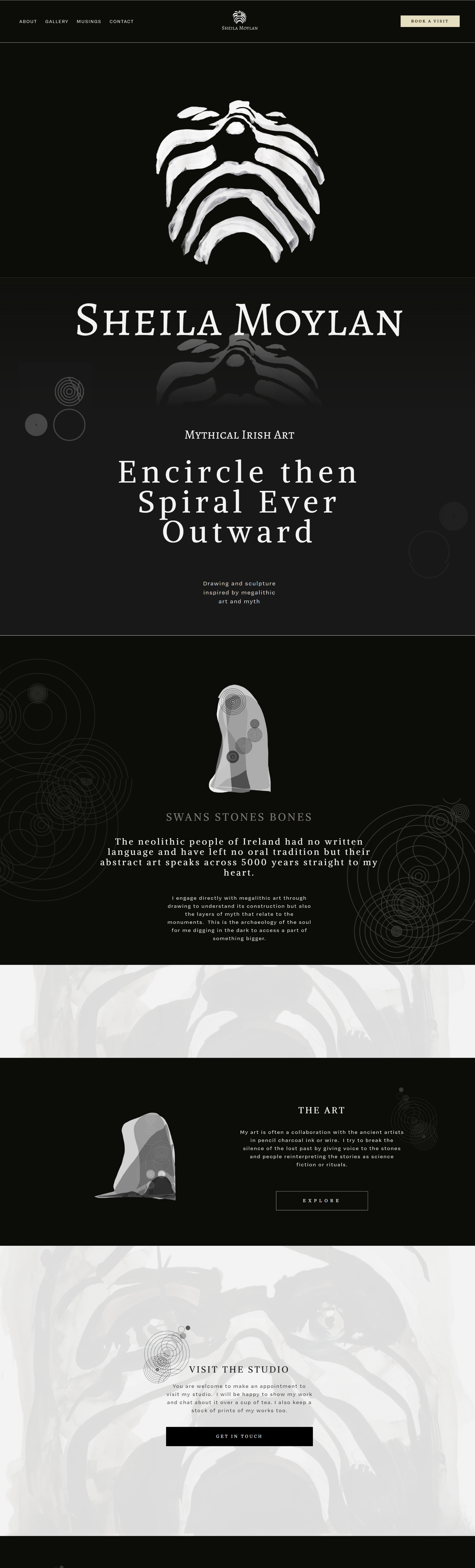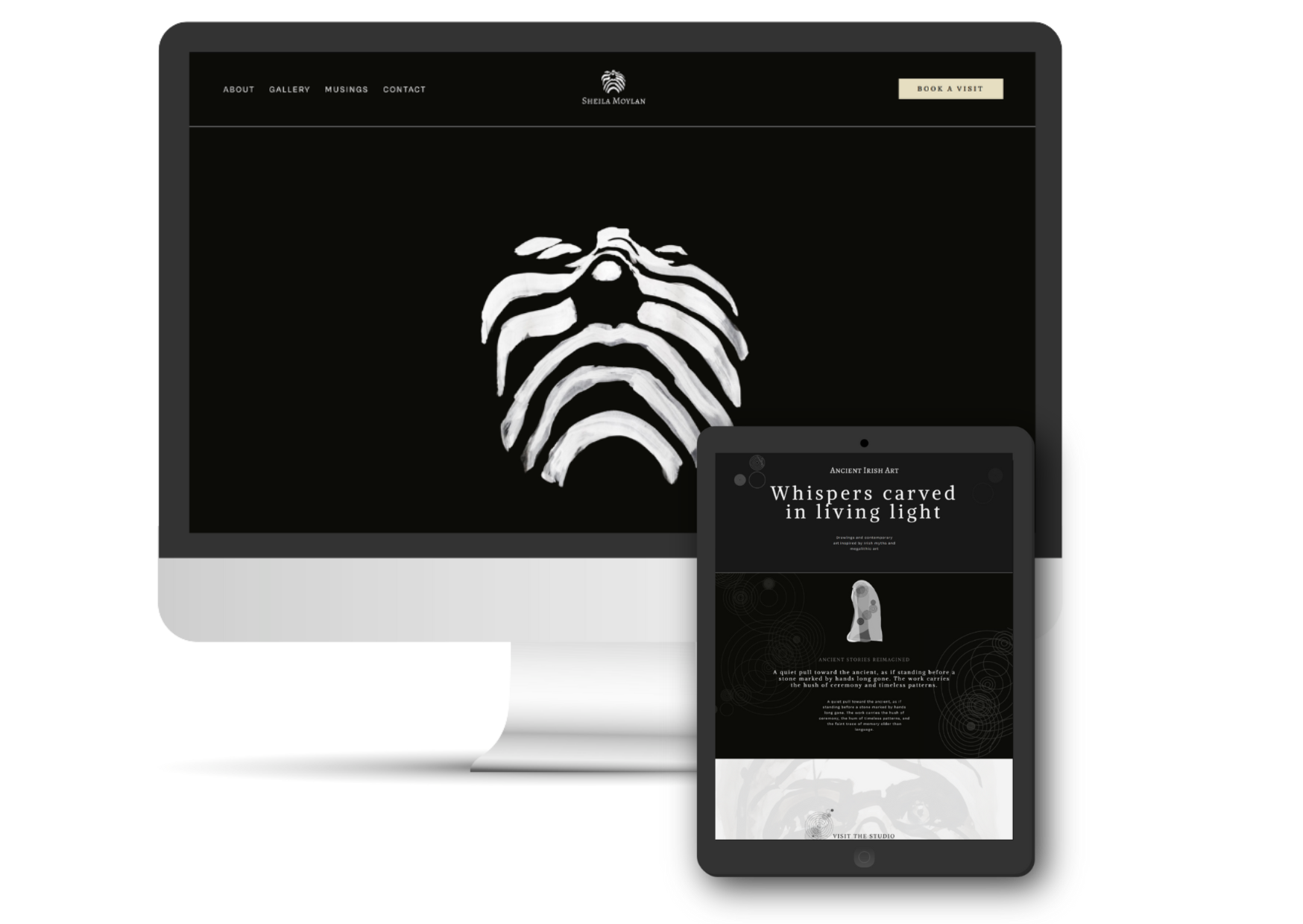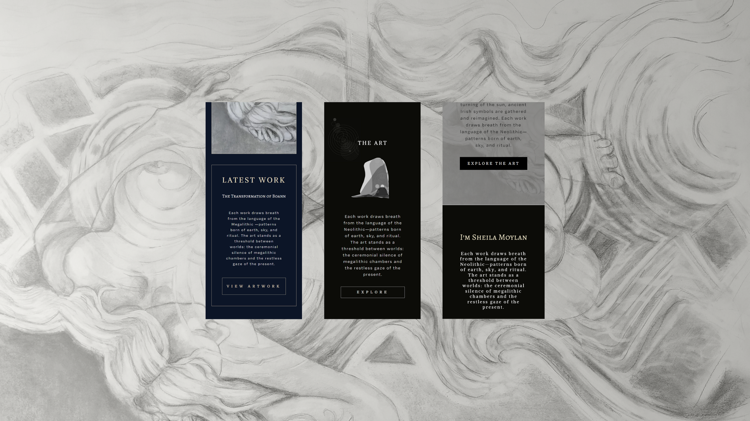 This website was for Sheila, an artist of Irish heritage whose work draws on Irish mythology and takes inspiration from ancient megalithic artwork found in Ireland. She was looking to redesign her website so that it would highlight her artistic exploration and the stories behind the work. Her goal was to captivate potential buyers, exhibitors and collaborators, and encourage people to see the work in person.